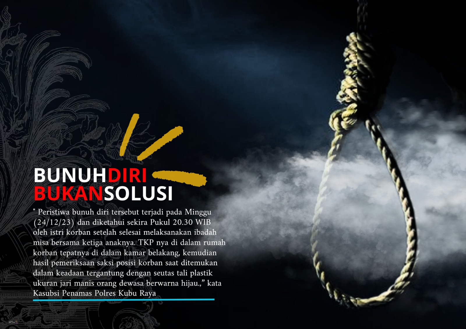 ” Peristiwa bunuh diri tersebut terjadi pada Minggu (24/12/23) dan diketahui sekira Pukul 20.30 WIB oleh istri korban setelah selesai melaksanakan ibadah misa bersama ketiga anaknya. TKP nya di dalam rumah korban tepatnya di dalam kamar belakang, kemudian hasil pemeriksaan saksi posisi korban saat ditemukan dalam keadaan tergantung dengan seutas tali plastik ukuran jari manis orang dewasa berwarna hijau, “kata Ade, Selasa (26/12/23) pagi.