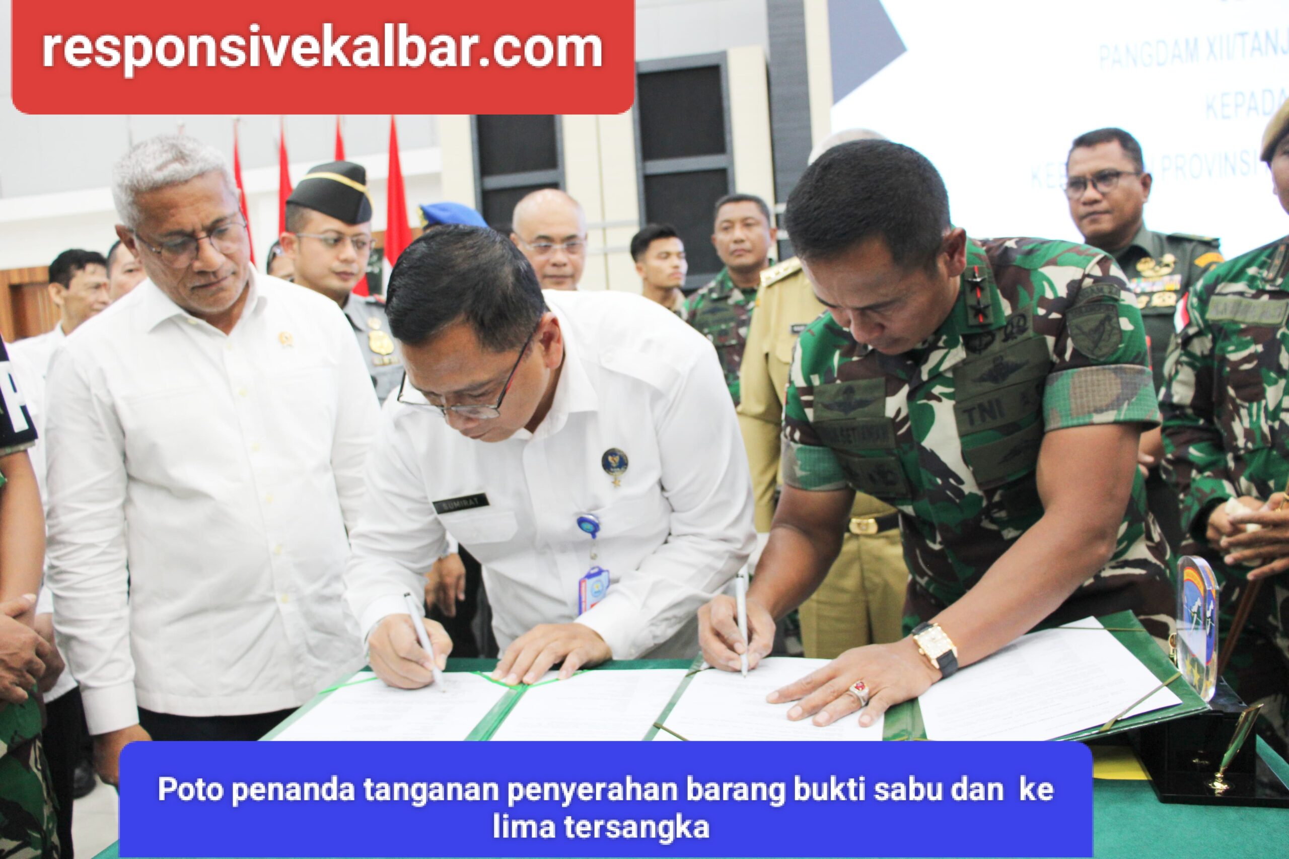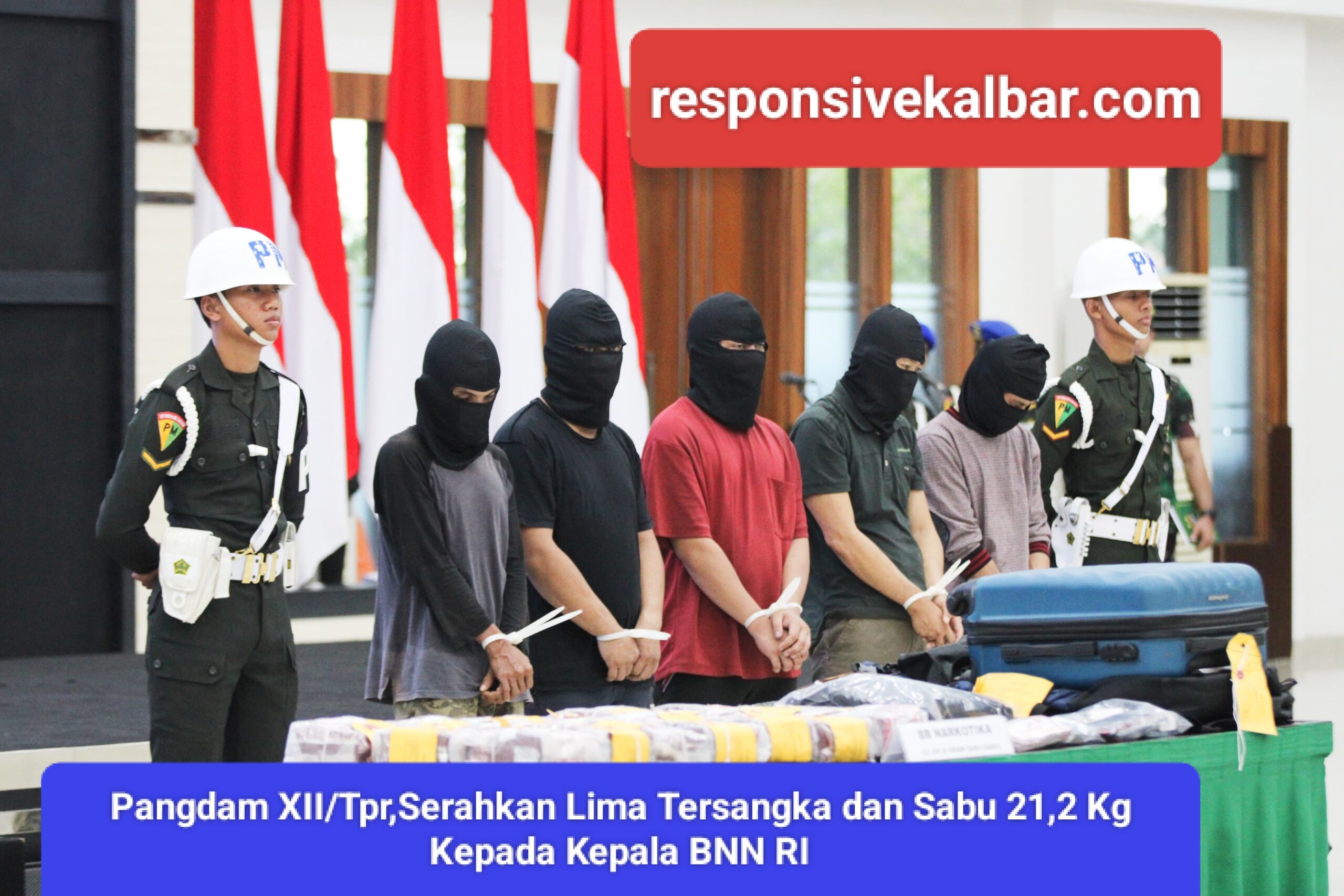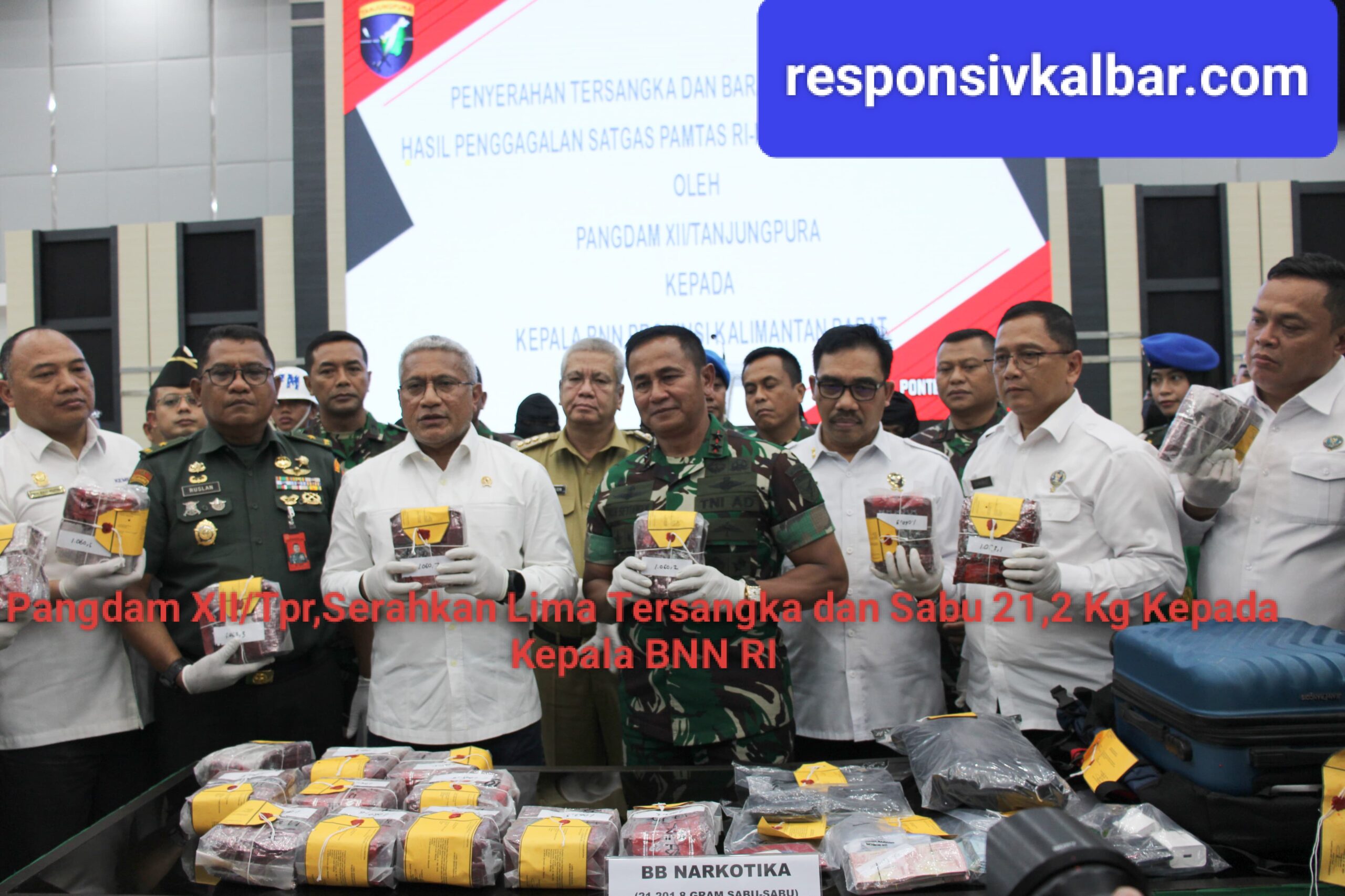 Responsivekalbar.com”-,Pangdam XII/Tanjungpura Mayjen TNI Iwan Setiawan,menyerahkan langsung lima orang pelaku dan barang bukti Sabu seberat kurang lebih 21,2 Kilogram ke Kepala BNN RI,Komjen Pol Martinus Hukom, Acara penyerahan berlangsung di Aula Sudirman, Makodam XII/Tpr.