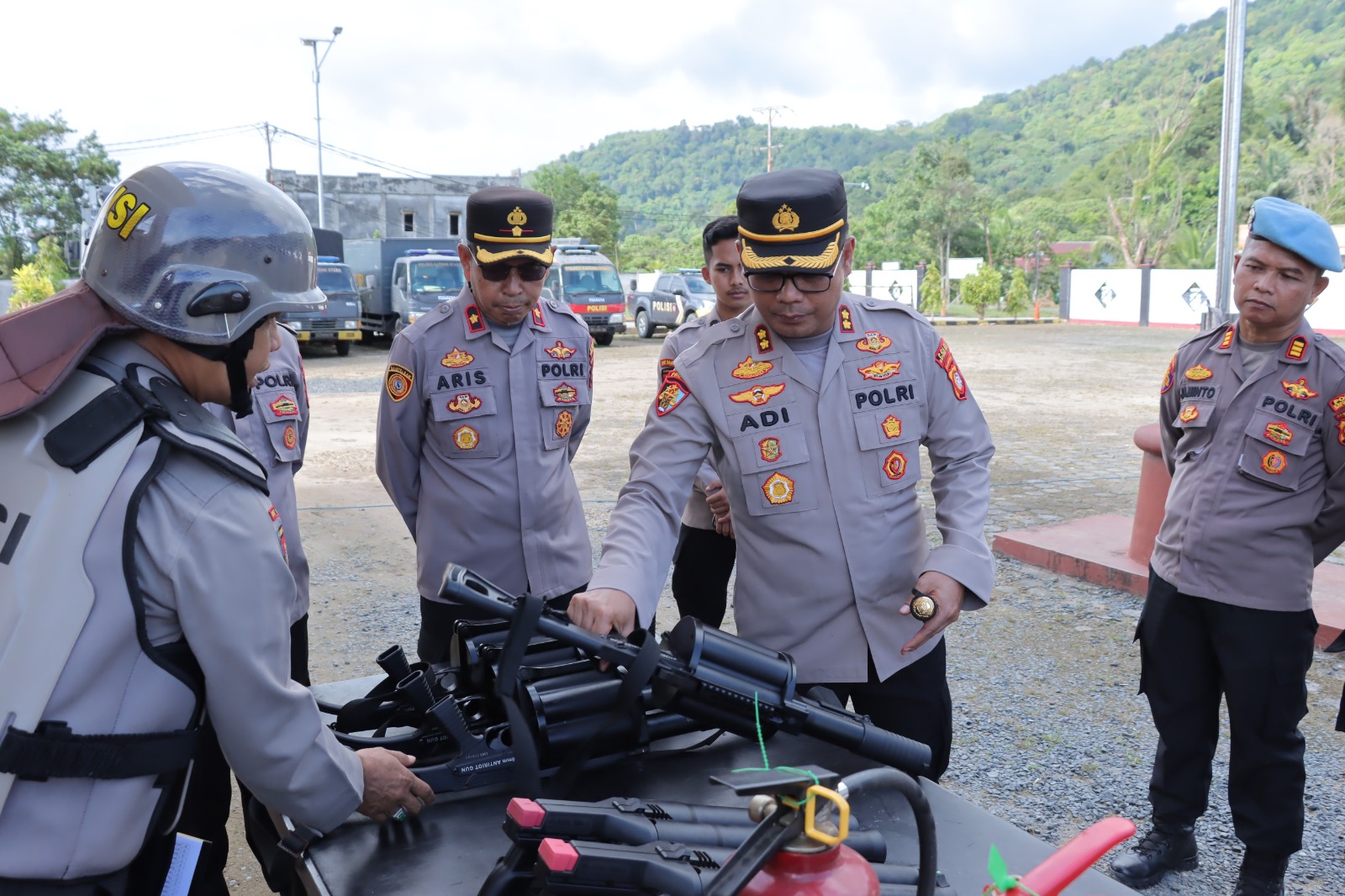 Pemeriksaan ini mencakup kelengkapan individu personel seperti tameng, tongkat dalmas, rompi pelindung, serta helm pengamanan.