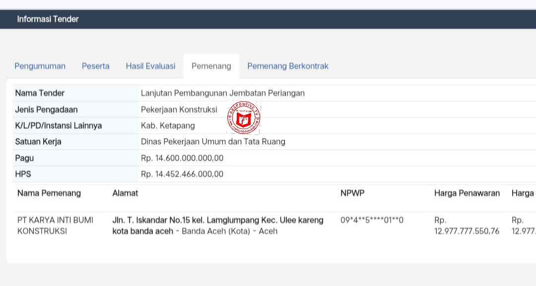 Di dalam Berita Acara Hasil Pelelangan (BAHP) Nomor : 600 /1601 / Pokja BPBJ / 0040/ 2025 tanggal 29 Agustus 2025. Kode Lelang 10065082000. Tertuang bahwa Lelang paket Proyek Lanjutan Pembangunan Jembatan Periangan dimenangkan oleh PT. KARYA INTI BUMI KONSTRUKSI. Namun hingga kini belum bisa berkontrak, diduga ada Tarik ulur kepentingan di internal DPUTR Ketapang.