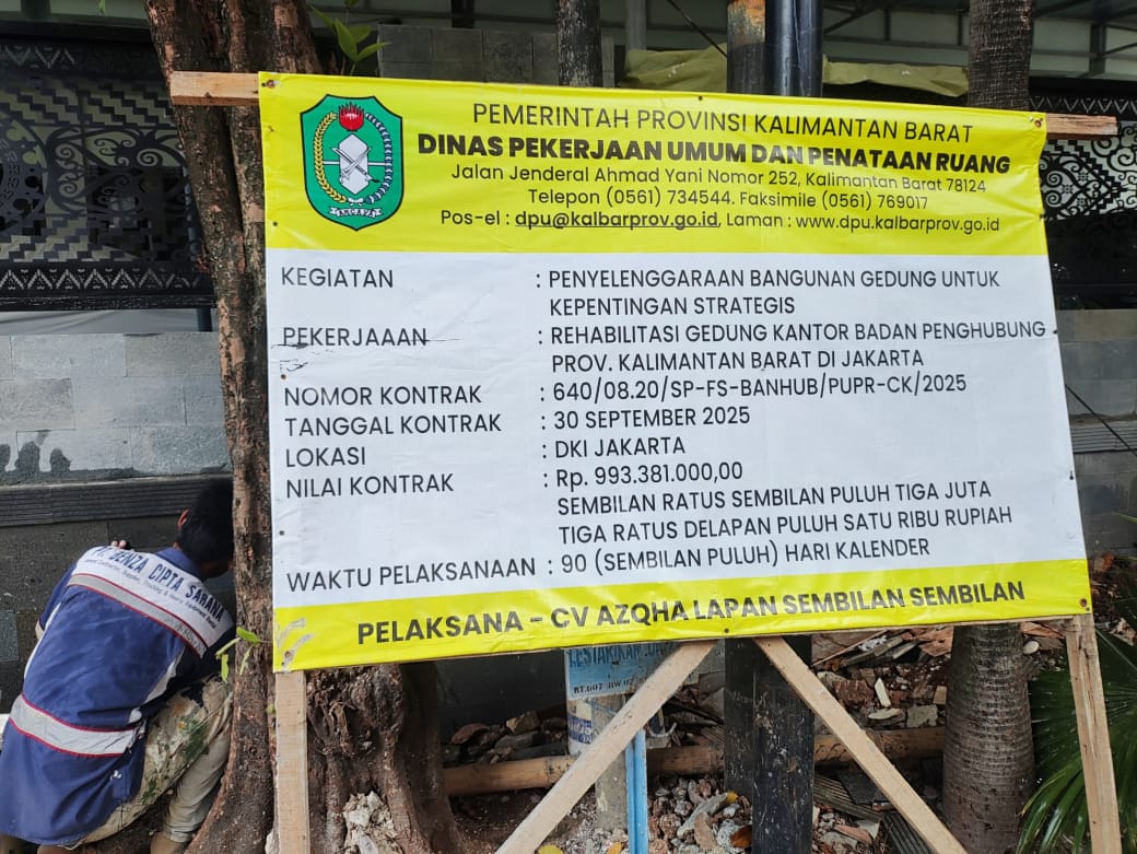 Proyek yang tercantum dalam papan informasi dengan judul “Rehabilitasi Gedung Kantor Badan Perhubungan Provinsi Kalimantan Barat di Jakarta” ini memiliki nilai kontrak mencapai Rp 993.381.000, dan dikerjakan oleh CV Azqha Lapan Sembilan Sembilan dengan waktu pelaksanaan 90 hari kalender.
