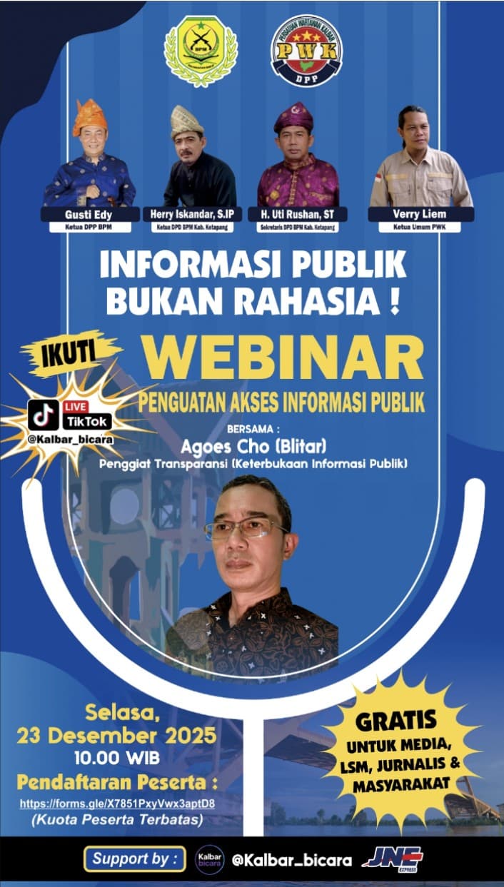 “Melalui webinar ini kita dapat belajar, menambah ilmu pengetahuan dari sumber yang kompeten, agar dapat kita implementasikan di lapangan. Mari jangan sampai ketinggalan momen penting bagi kita yang berprofesi sebagai insan pers, jurnalis atau wartawan, juga LSM,” pungkas Verry sambil mengajak berbagai elemen masyarakat untuk mengikuti kegiatan tersebut.